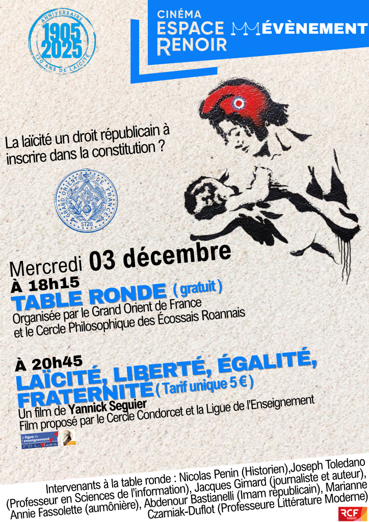 Dans le cadre d’une soirée spéciale au tour de l’anniversaire des 120 ans de la loi 1905, le Cercle Condorcet et la Ligue de l’enseignement42 proposent à l’Espace Renoir de Roanne la projection – en avant première- du film historique de Yannick SEGUIER.